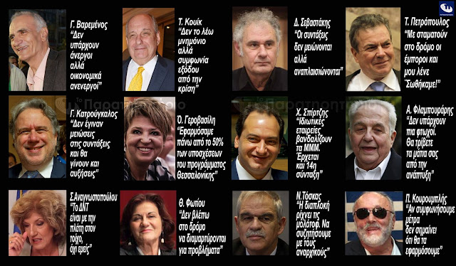 * ΔΕΝ είχαν μυωπικούς και αναξιόπιστους ηγέτες και υπουργούς οι οποίοι αφού υπογράφουν το μνημόνιο και στη συνέχεια δύσκολα μέτρα, δεν τα πιστεύουν και ακολούθως δεν τα εφαρμόζουν ούτε τα υποστηρίζουν απέναντι στους πολίτες. Οι Ελλαδίτες ζήσαμε τη φαιδρότητα ενός Πρωθυπουργού και μιας κυβέρνησης οι οποίοι ενώ υπέγραψαν το πρώτο μνημόνιο, στη συνέχεια επί ενάμιση έτος αρνούνταν πεισματικά να το υλοποιήσουν σε ό,τι αφορά τις διαρθρωτικές μεταρρυθμίσεις και τις αποκρατικοποιήσεις, εξασφαλίζοντας έτσι τελικά για τον εαυτό τους το μοναδικό προνόμιο να υβρίζονται από την Ελλαδική κοινωνία ταυτόχρονα ως «μνημονιακοί» και ως «αντιμνημονιακοί».